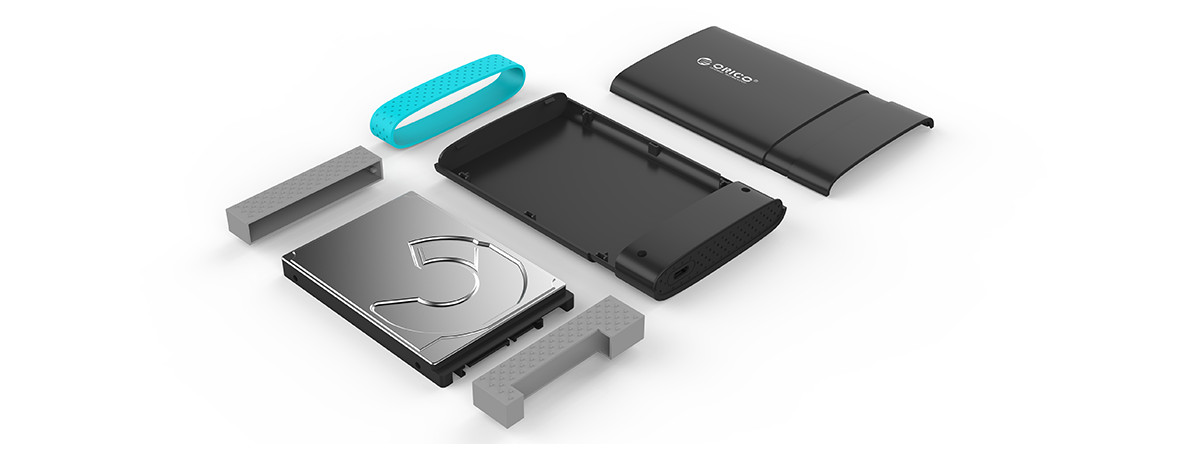 外部采用橡胶圈捆绑方式,牢牢套住硬盘盒,使硬盘跟硬盘盒更稳固,防止硬盘盒滑动或跌落。