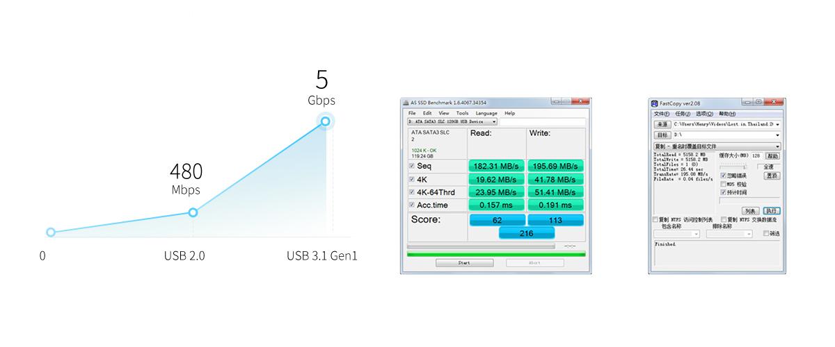 采用USB3.1 Gen2 To SATA3.0桥接方案,理论传输速率可达10Gbps (需另外搭配USB3.1 Gen2 Type-C 数据线使用) 原装附送USB3.1 Gen1 Type-C数据线,支持5Gbps速率。