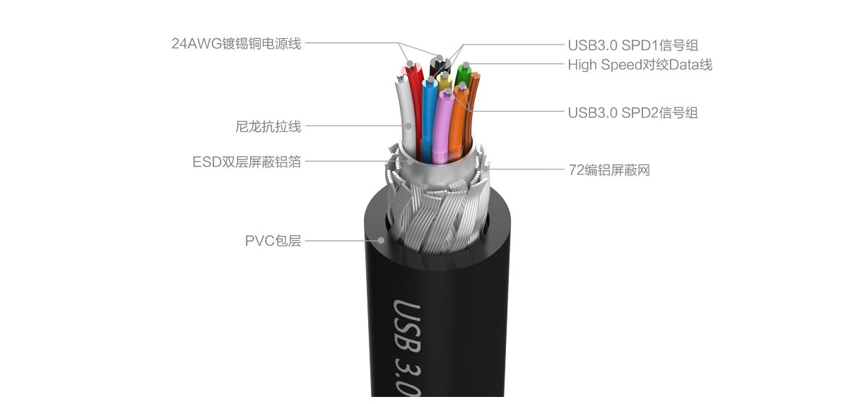 业内USB3.0线材供应商,选用带屏蔽的无氧铜芯线,传输供电性能、运行速度和稳定性都大幅提升。