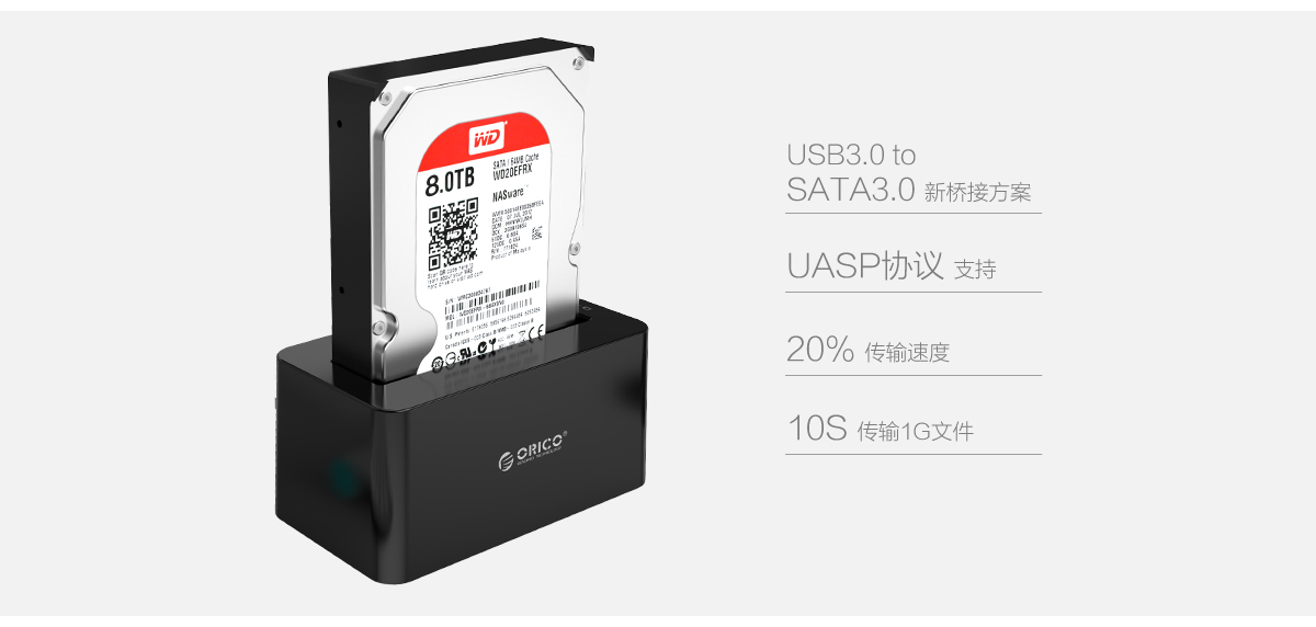 ORICO 6619C3采用USB3.0 to SATA3.0桥接方案,不仅传输速度快、供电足且兼容性好,还支持UASP协议。该协议提供大容量储存设备的传输速度高达20%,降低CPU的利用率、数据延迟和等待时间。配合高性能SSD固态硬盘传输1G文件大概需要10s。