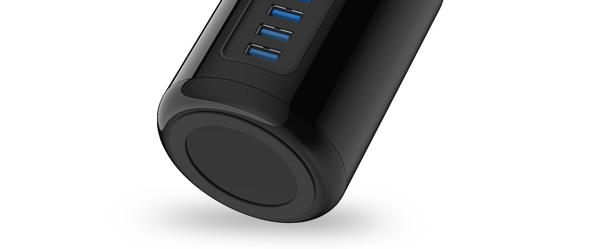 采用了高强度工程材料,表面的钢琴烤漆亮面与顶部的磨砂材质形成鲜明对比。这种刚柔兼具的质感设计同时运用在一款USB集线器上,无处不彰显我们的用心。