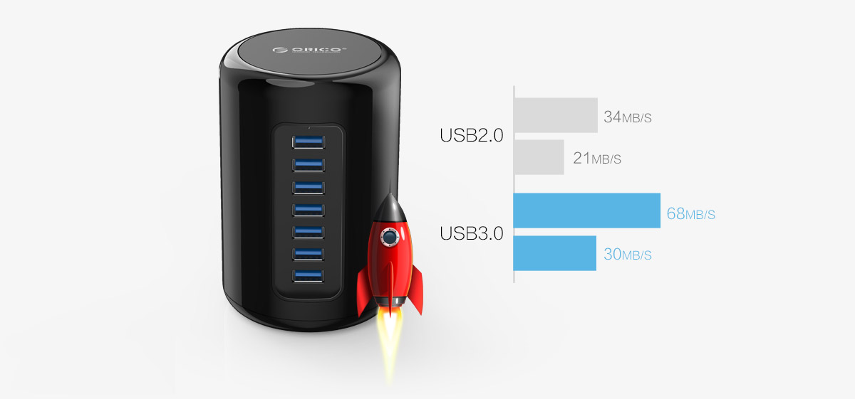 还在为外接设备越来越多而凌乱吗,还在为USB接口不足而烦恼困扰吗,ORICO RH7-U3一次性为您提供7个接口,解决您的接口稀缺烦恼。同时,理想的接口排列间隙分布,即便用同时段使用7个端口,也不会产生因排插之间过于拥挤而使USB接口出现插拔困难的情况。