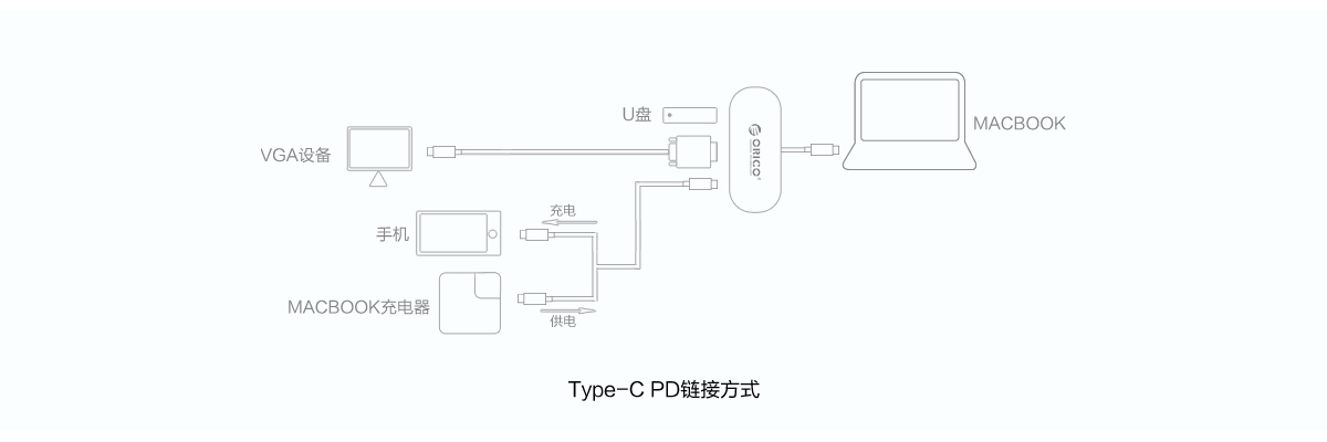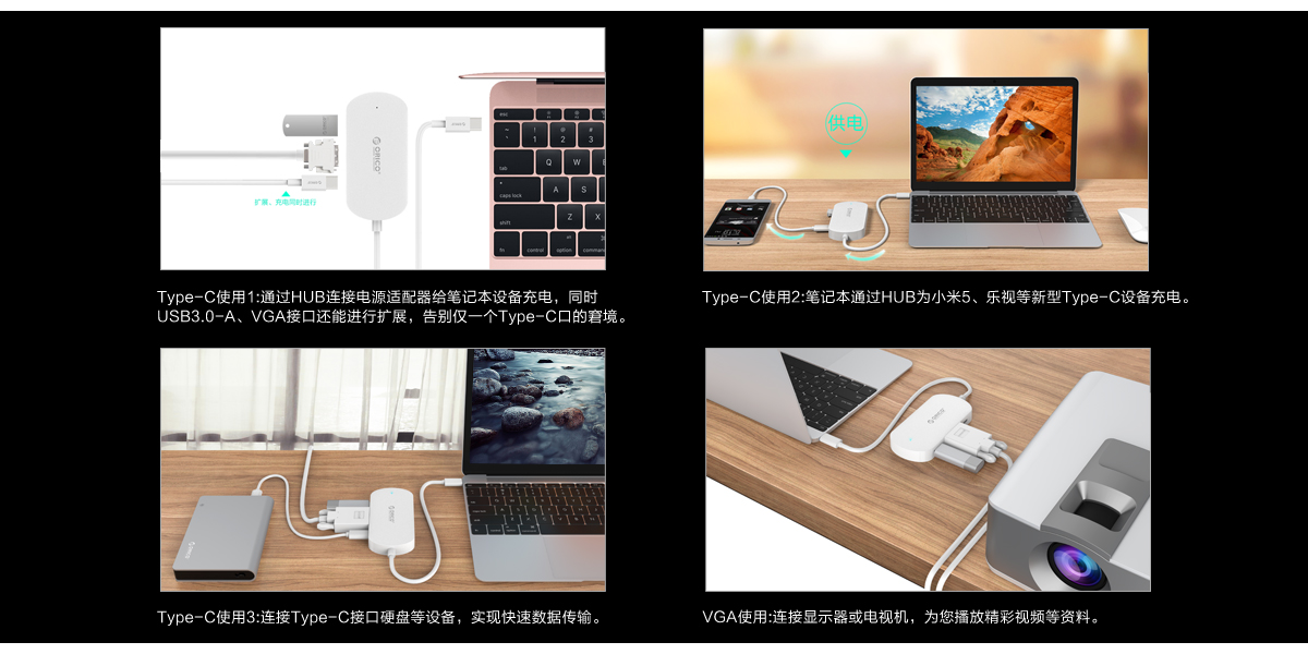 Type-C使用1,通过HUB连接电源适配器给笔记本设备充电,同时USB3.0-A、VGA接口还能进行扩展,告别笔记本只有一个Type-C接口的窘境;