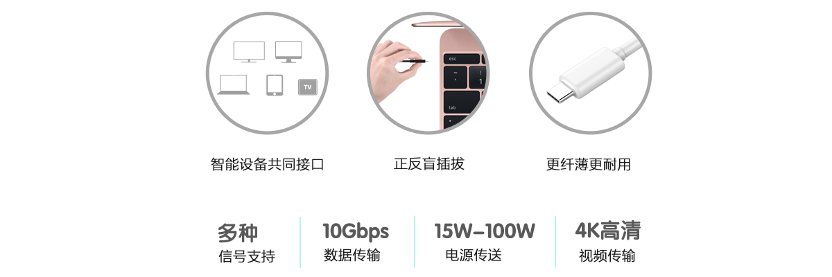 Type-C拥有正反盲插拔的易用性,且其更纤薄更耐用,同一条线缆可支持USB2.0、USB3.0、PCIe、DisplayPort和Thunderbolt等多种信号,同时拥有更高数据传输效率(10Gbps)、大功率电源传送(15W-100W)、可实现4K高清视频传输,将成为新生代设备的主流接口。