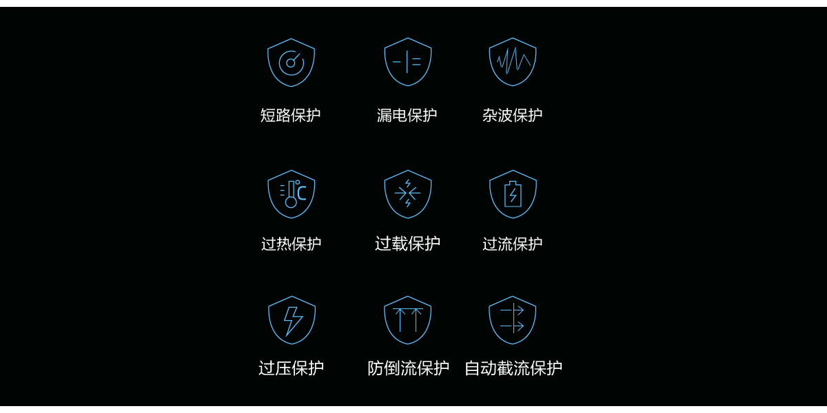 内置了七重标准化保护系统可防过热、过载、过流、过压、短路、漏电、杂波问题,让您使用起来舒适安心。