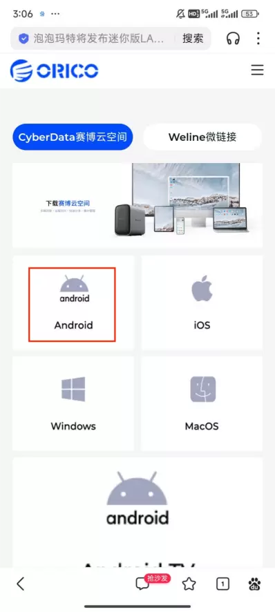 1、复制赛博云软件下载地址,粘贴到百度浏览器的搜索框,点击搜索 → 点击安卓版本下载软件