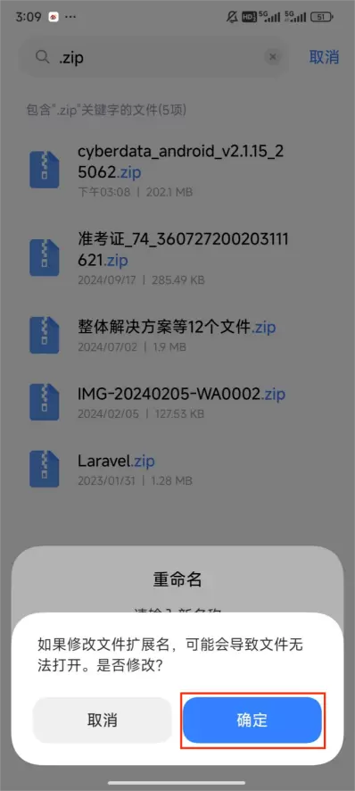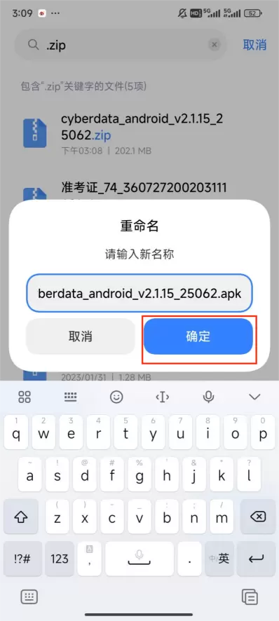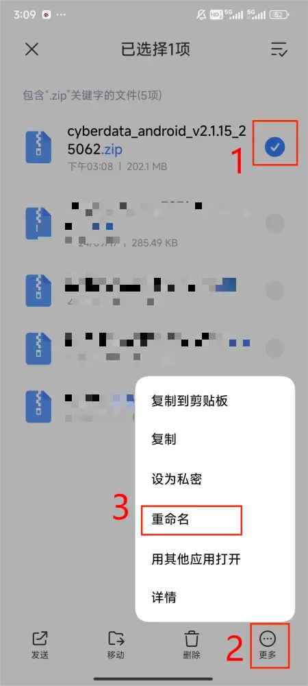 4、长按下载好的赛博云安装包,点击右下角“更多”-“重命名” → 把“zip”删掉改为“apk”后点击确定