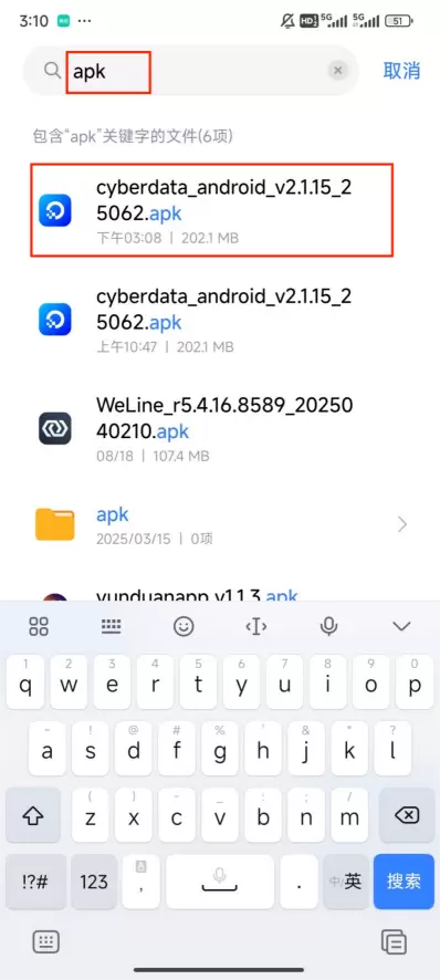 5、修改完成后点击搜索框搜索“.apk”,找到下载的赛博云安装包,点击安装