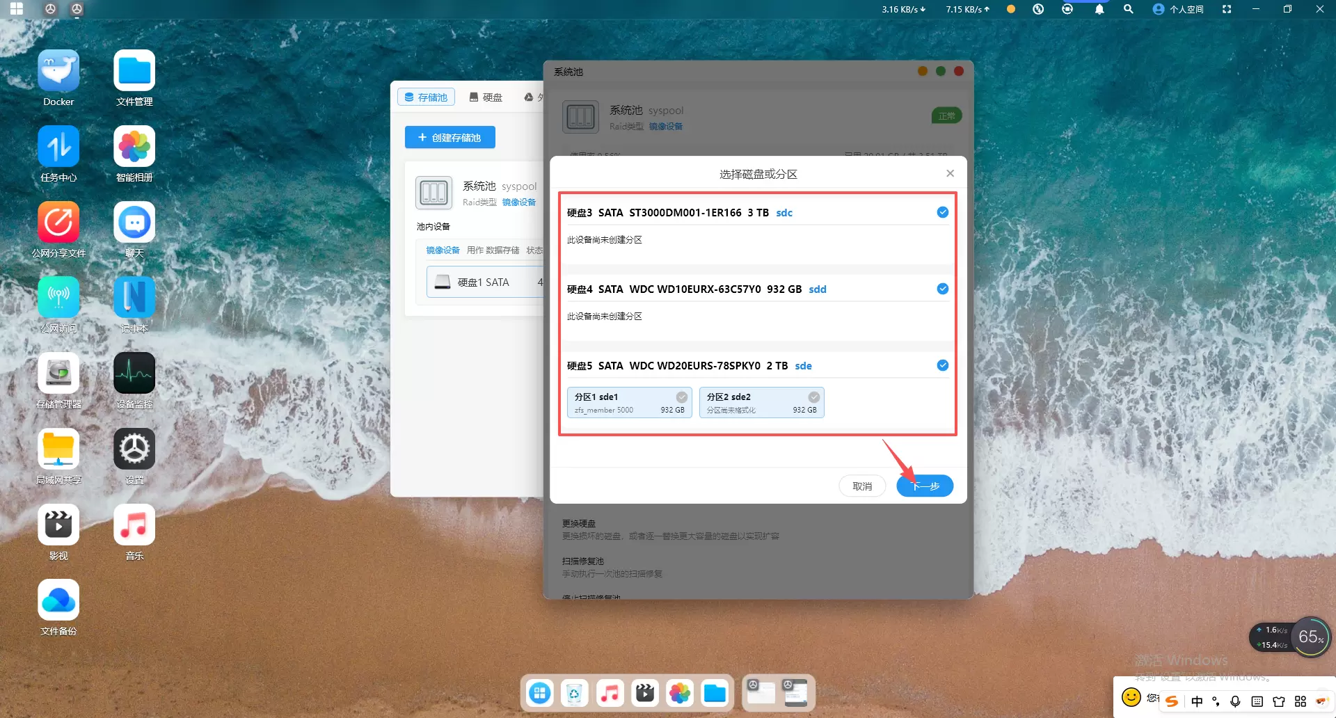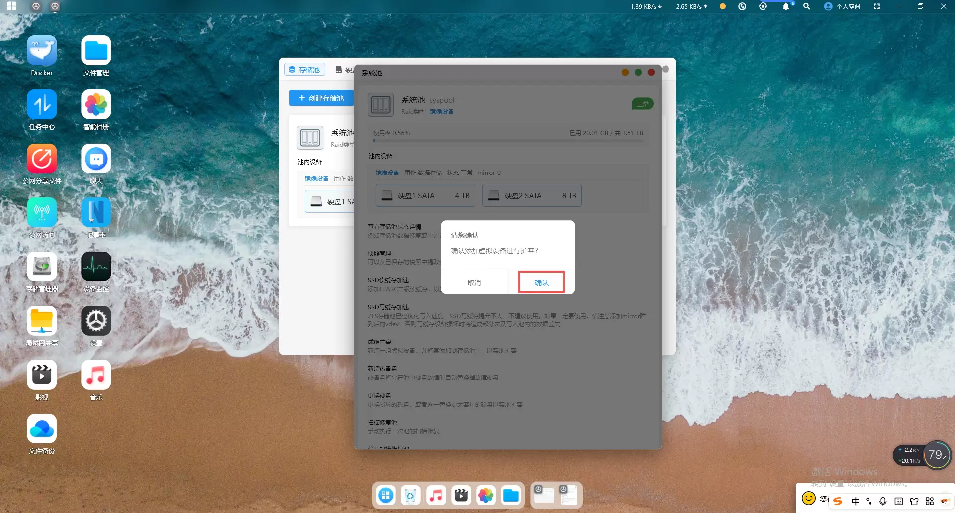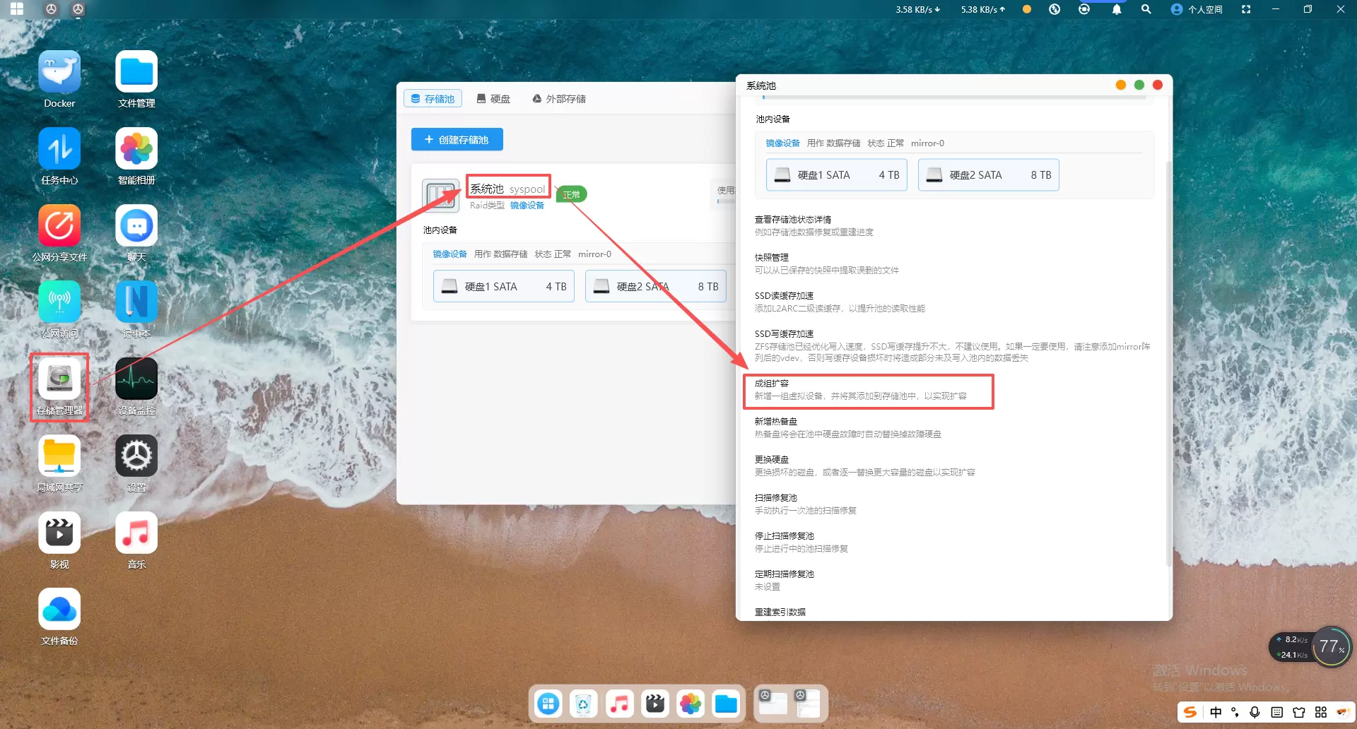 打开赛博云APP-存储管理器-存储池,点击“系统池”-成组扩容