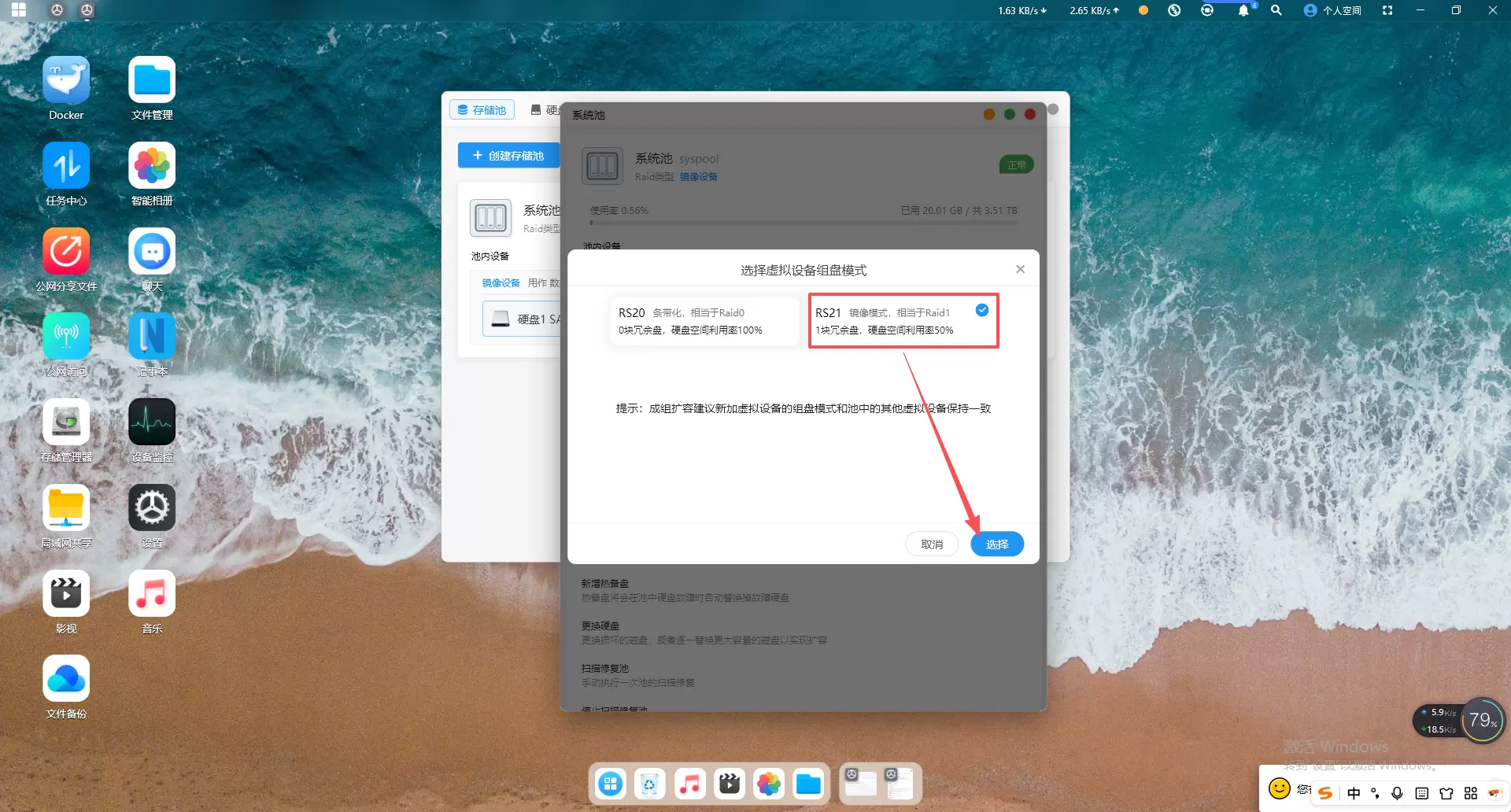 一定要选择带冗余模式,勾选图中“RS21 镜像模式”选择确认扩容