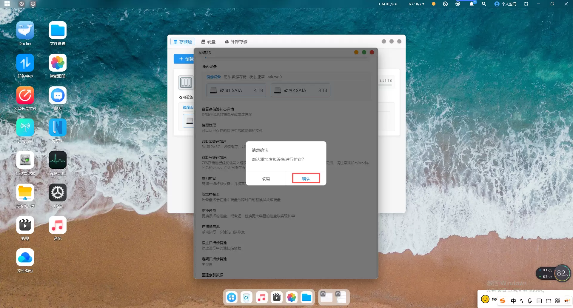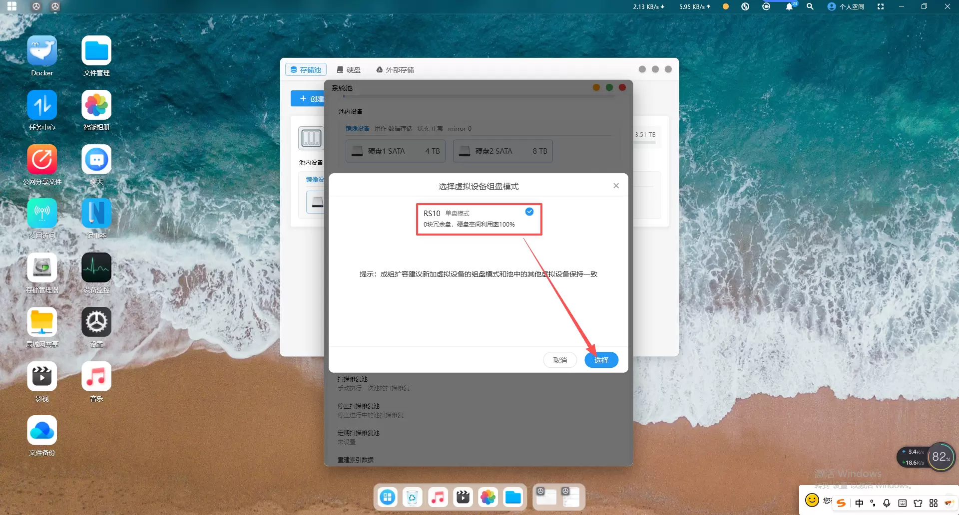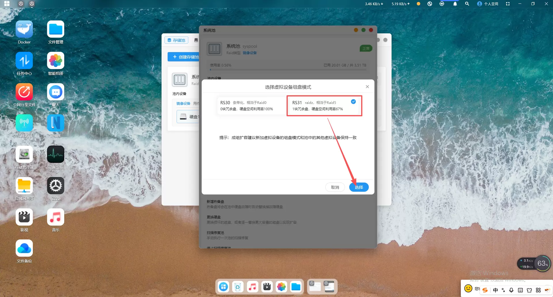 一定要选择带冗余模式,勾选图中“RS31 raidz”选择确认扩容