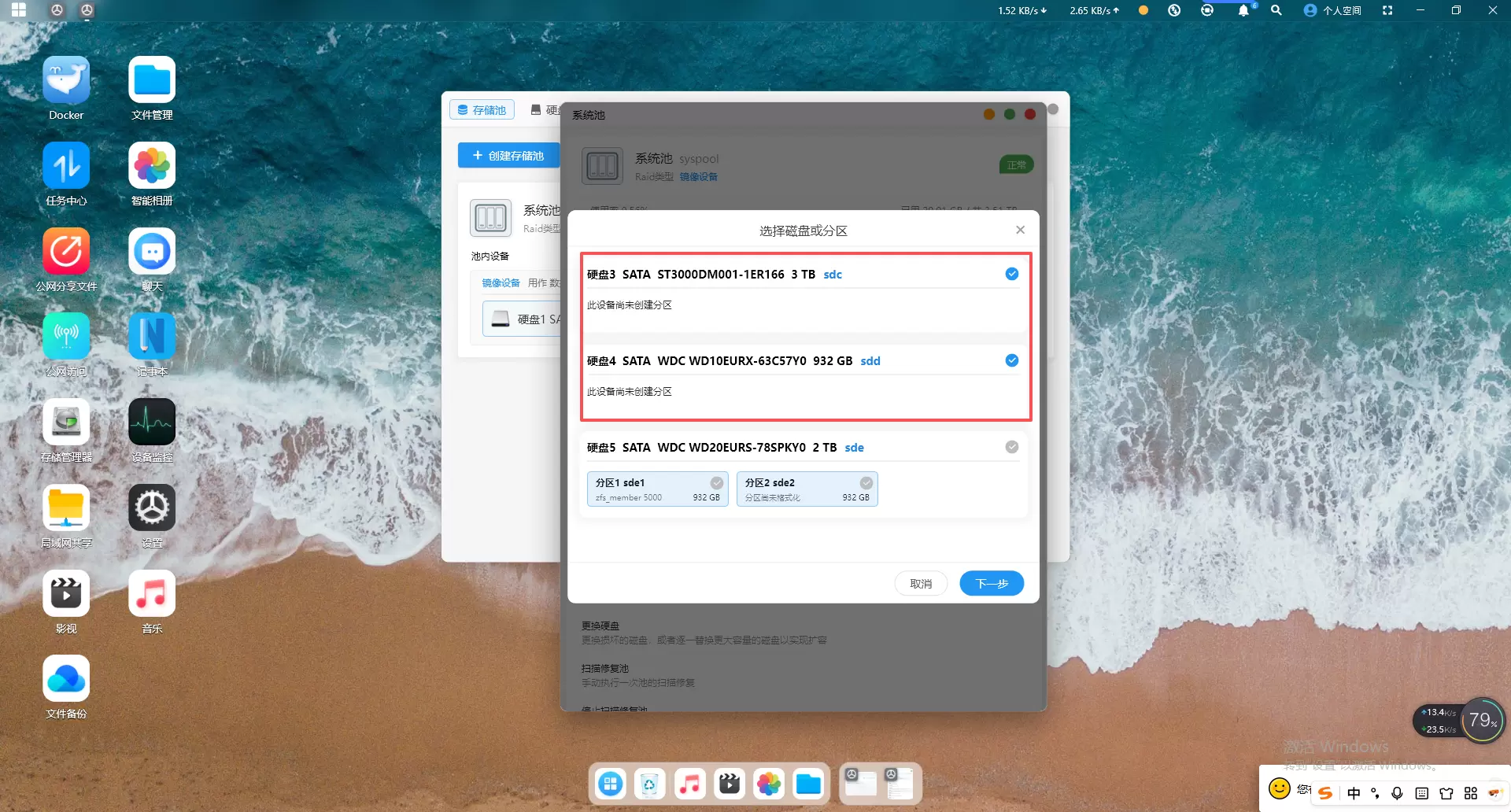 (1)点击“成组扩容”后,选择两块硬盘点击“下一步”
