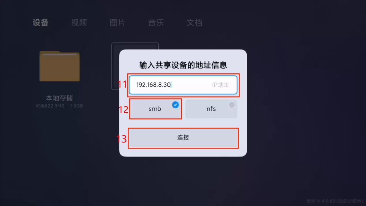 5、点击“添加设备”,输入NAS设备的局域网ip地址(NAS设备ip地址在赛博云app-设置-网络管理-网卡处可看到),选择“smb”后点击连接