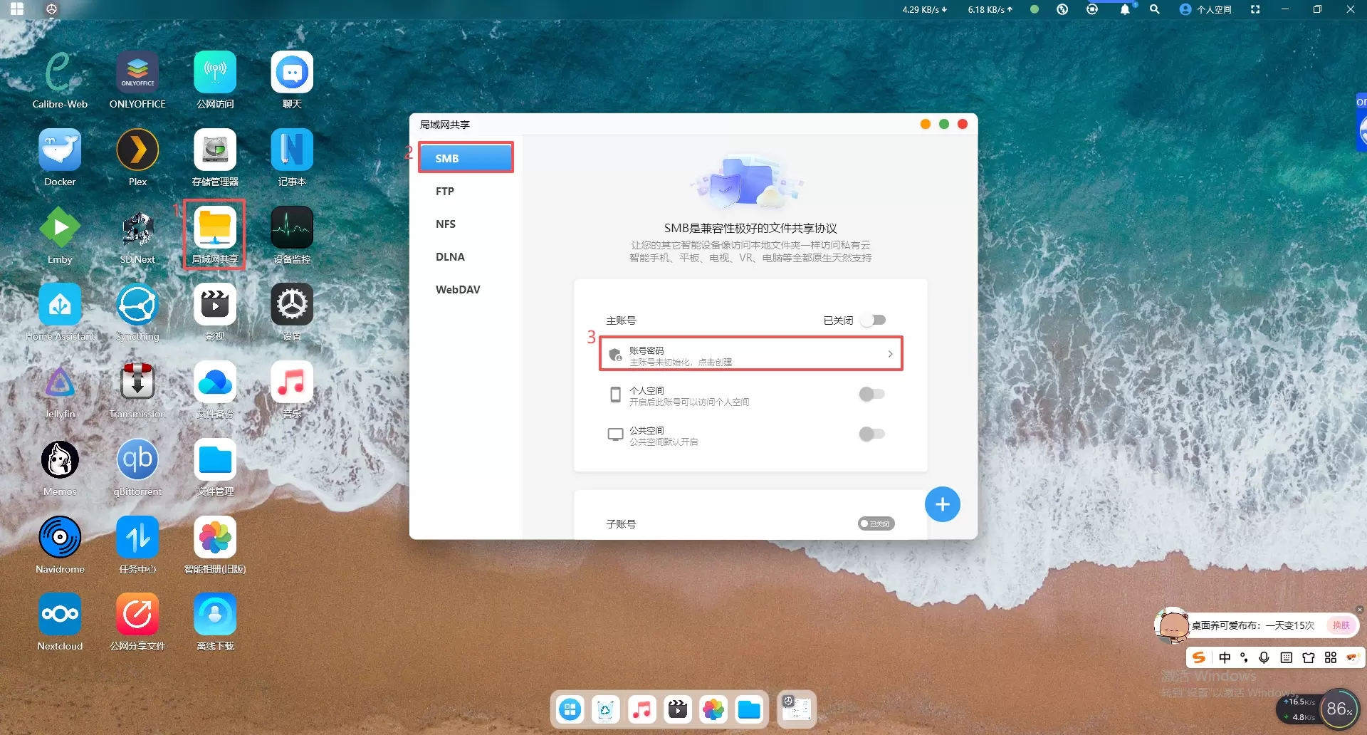 1、打开赛博云app,点击首页的“局域网共享”,选择“Samba”,进到设置界面。点击“账号密码”进行设置。