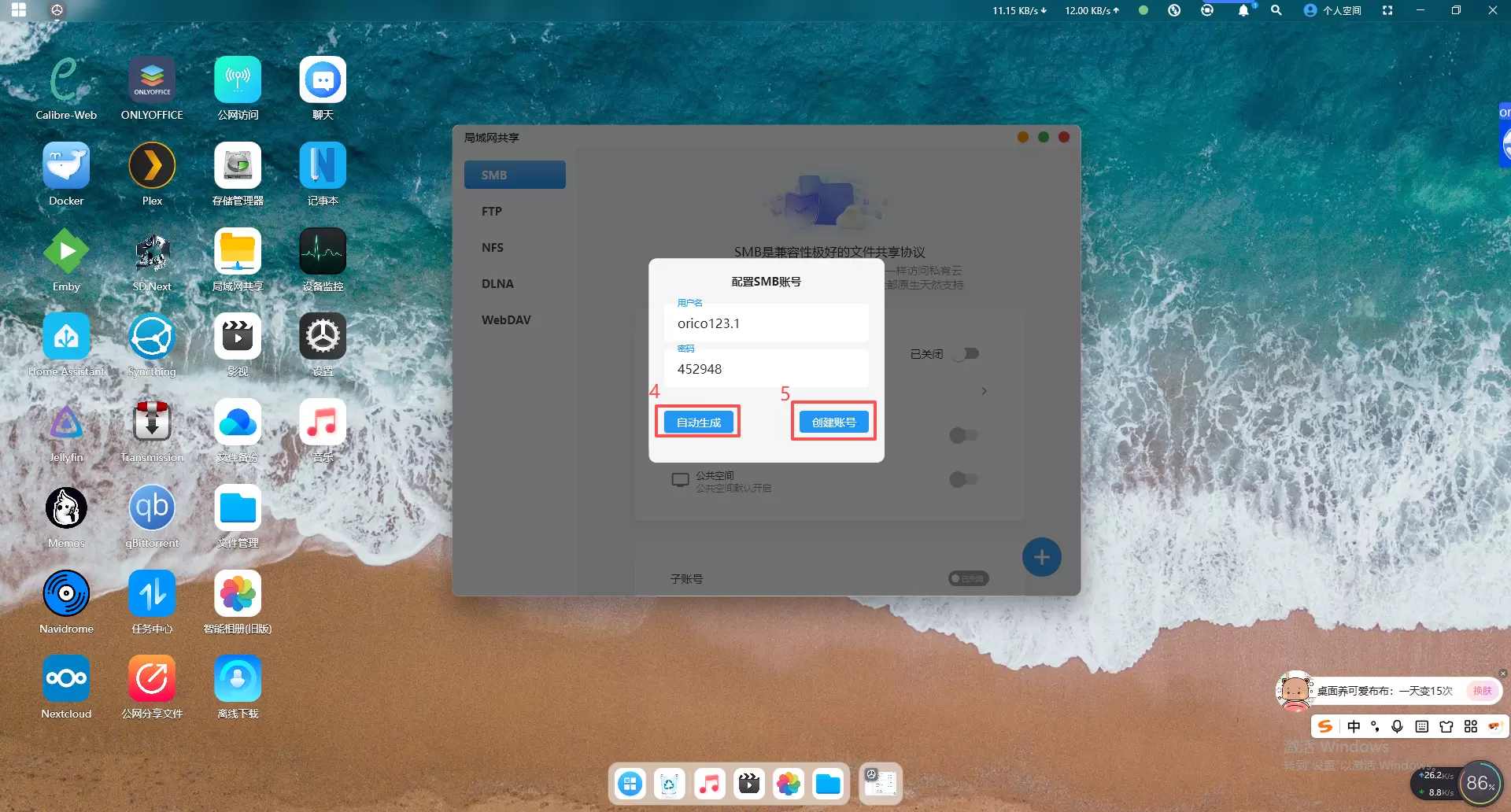 2、在弹出的窗口可以点击左下角的“自动生成”来根据用户名生成一个账号,也可以手动设置,然后点击右下角的“创建账号”即可完成账号的创建。