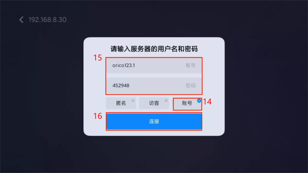 5、连接NAS设备后会出现“请输入服务器的用户名和密码”弹窗,选择“账号”,再填写上方的账号与密码