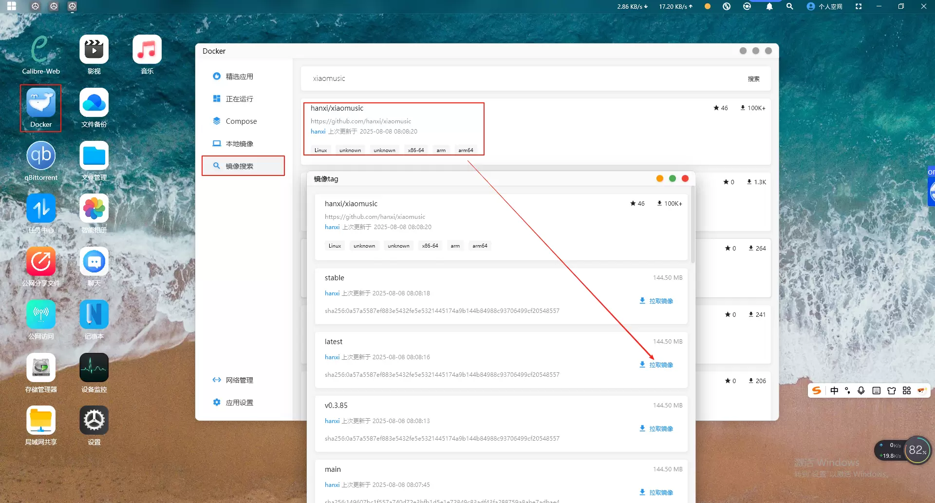 1、登录赛博云软件,单击docker->镜像搜索->输入xiaomusic回车,在搜索结果中点击想要的镜像,会弹出tag选择页面。