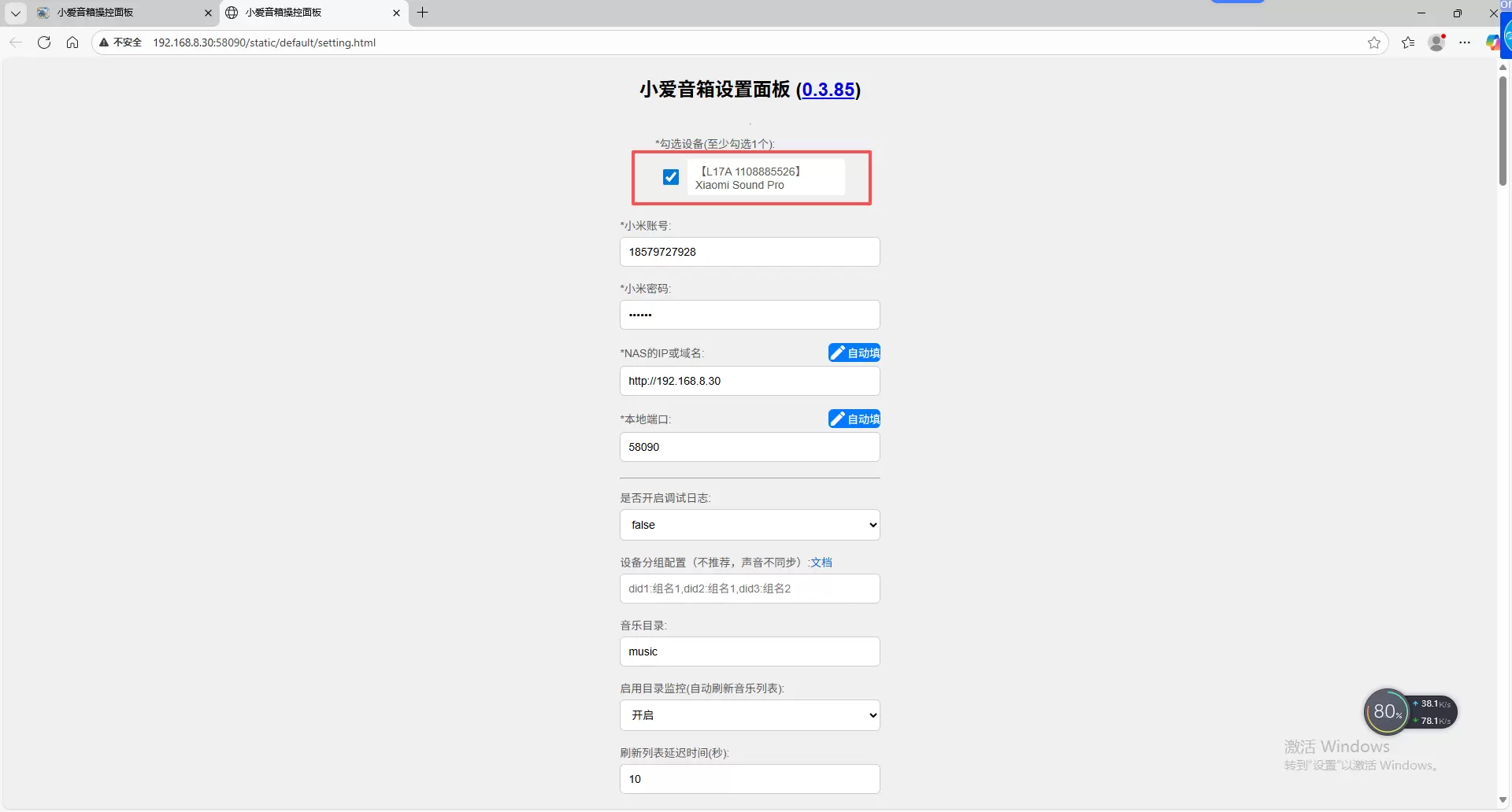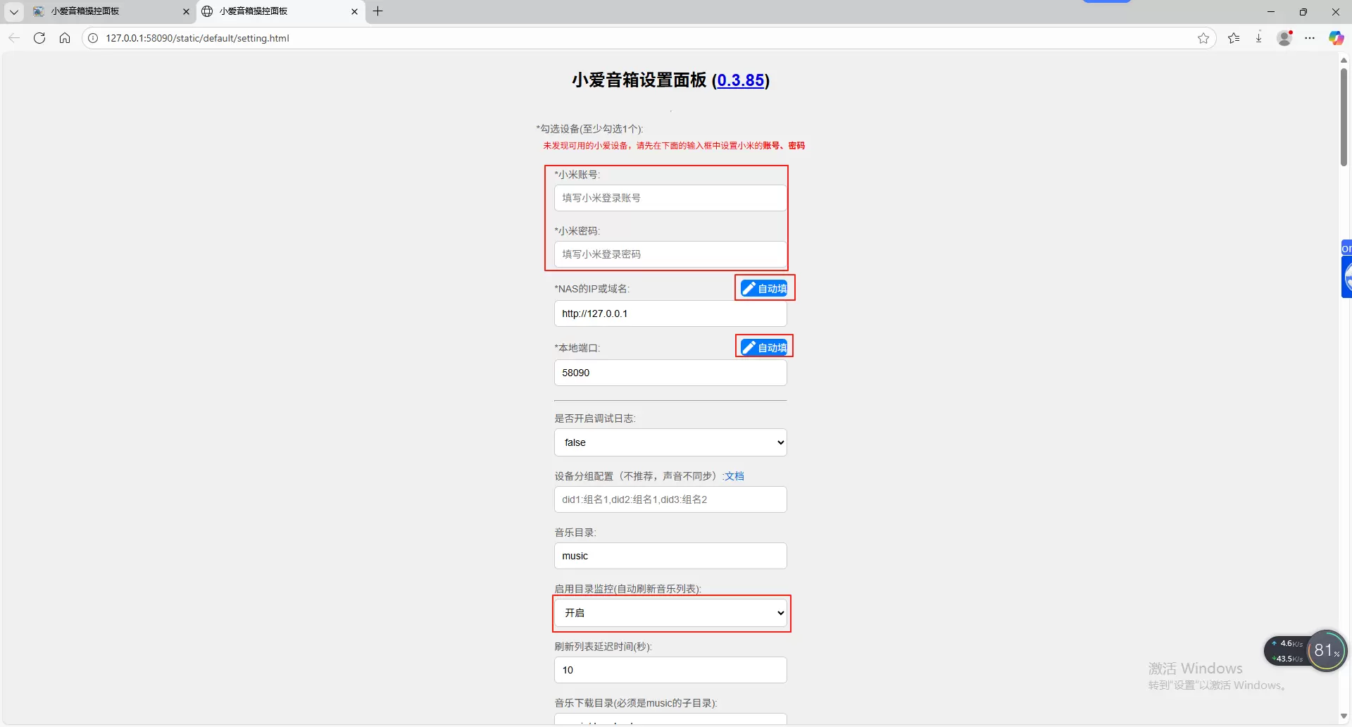 输入你在小米官方注册的账号和密码,NAS的ip和端口点击右边“自动填写”按钮,启用目录监控(自动刷新音乐列表)选择开启