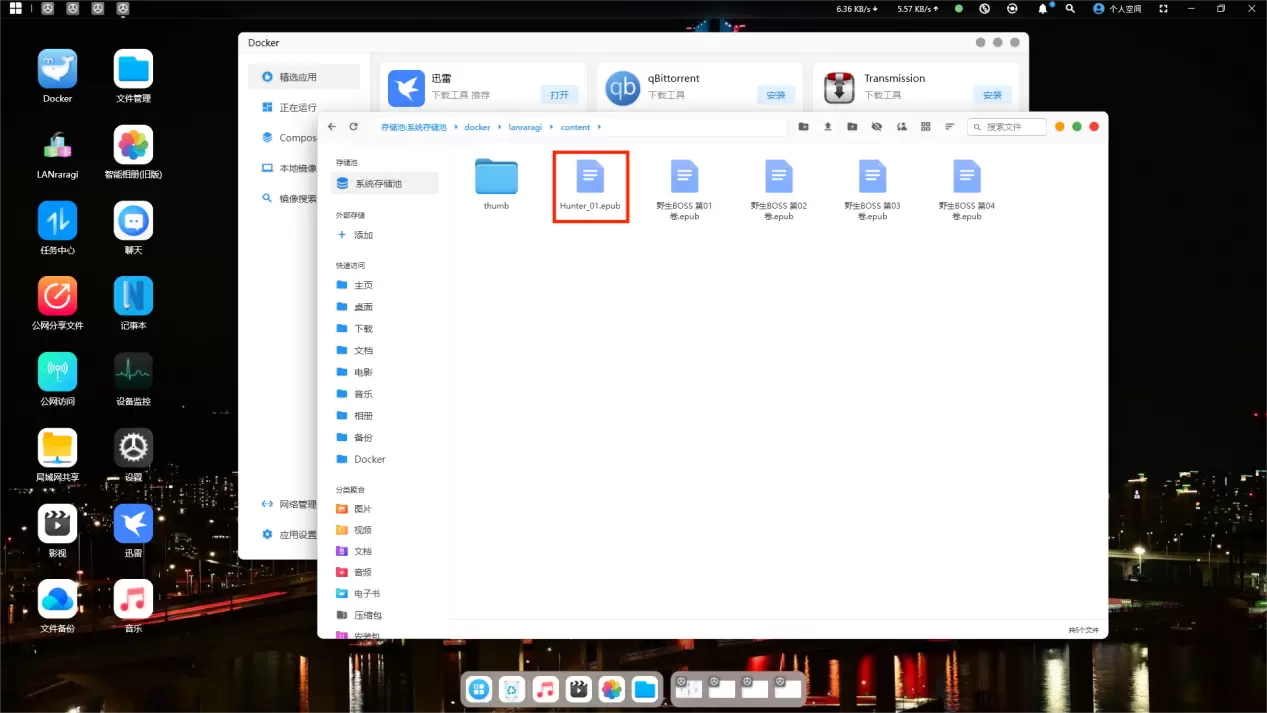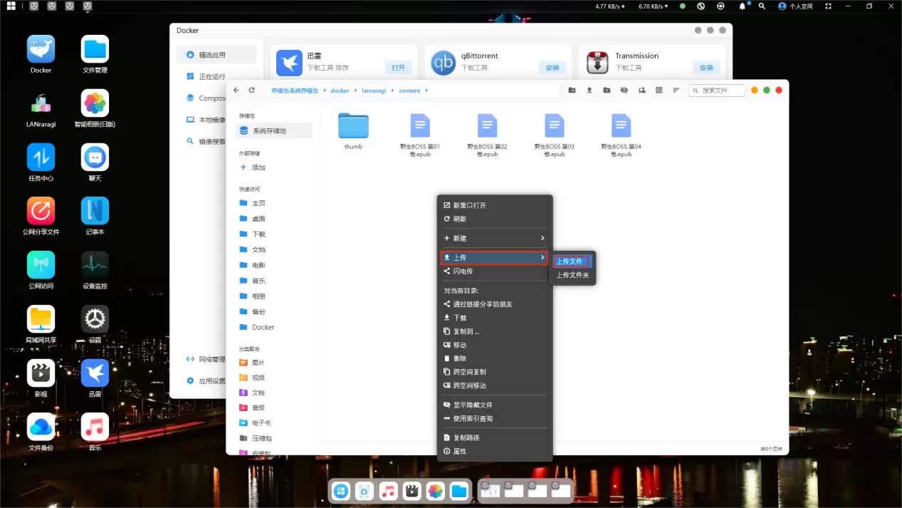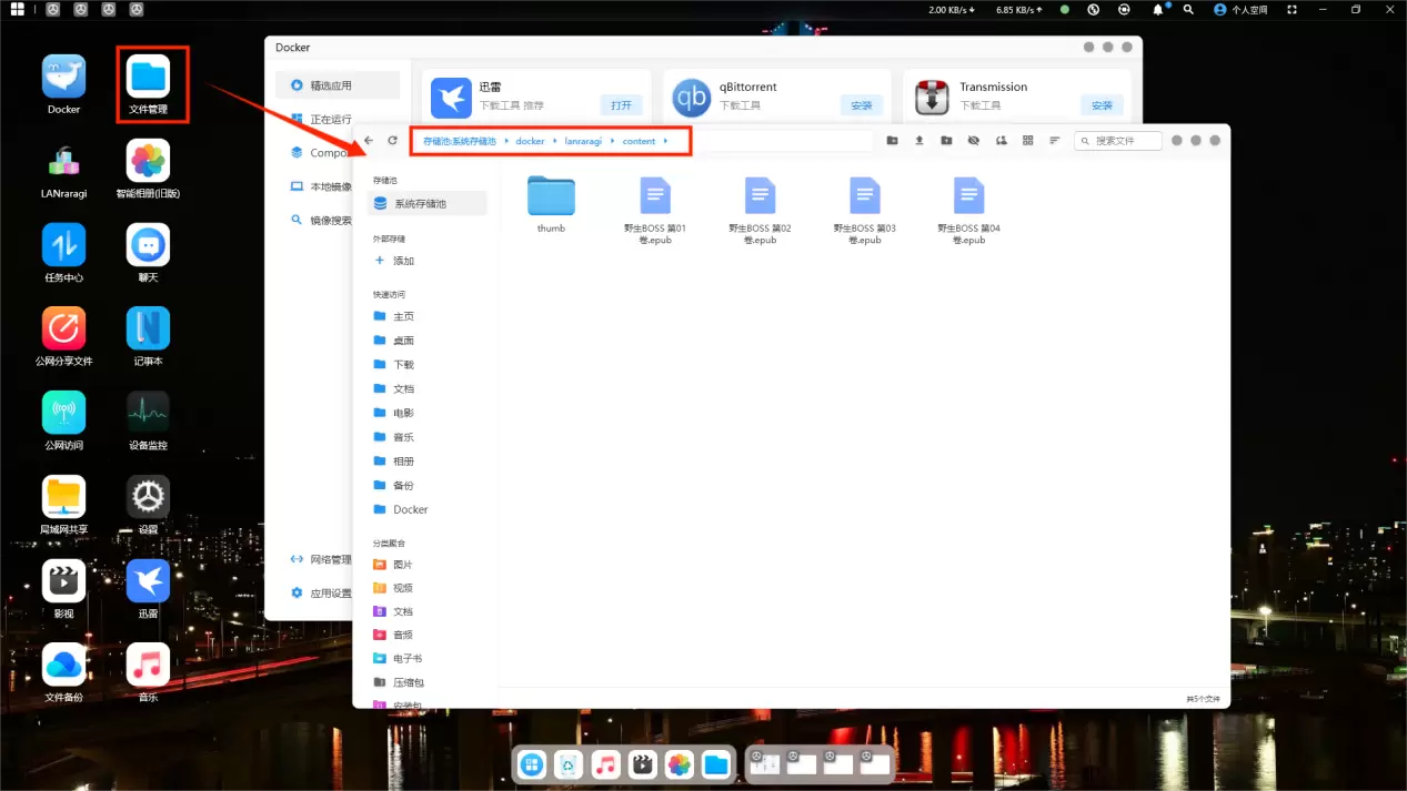 打开赛博云软件-文件管理,/ufi/pool-raw/syspool/docker/lanraragi/content依次点开该目录,并把文件上传到该目录下
