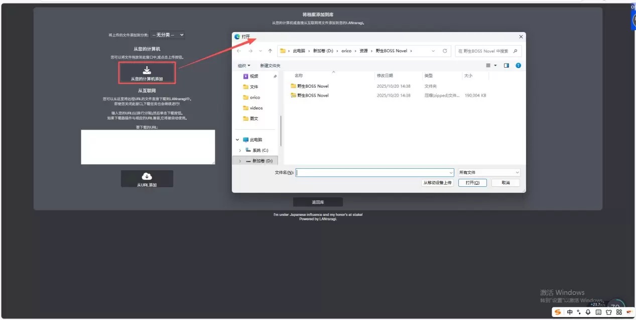 点击上方“添加档案”,“从您的计算机添加”选择需要上传的动漫、漫画等