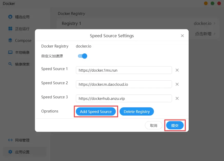 打开自定义加速源选项开关,Docker Registry填写代理源仓库地址,Speed Source 1填写镜像加速源地址,点击Add Speed Source可添加多个镜像加速源地址,提交。