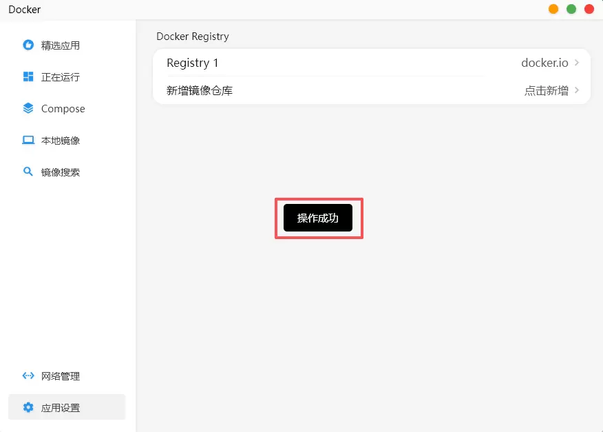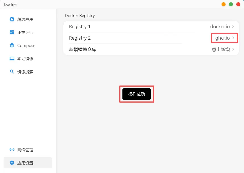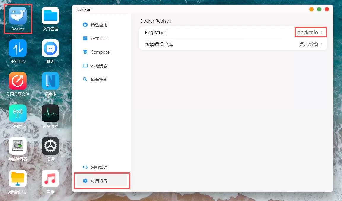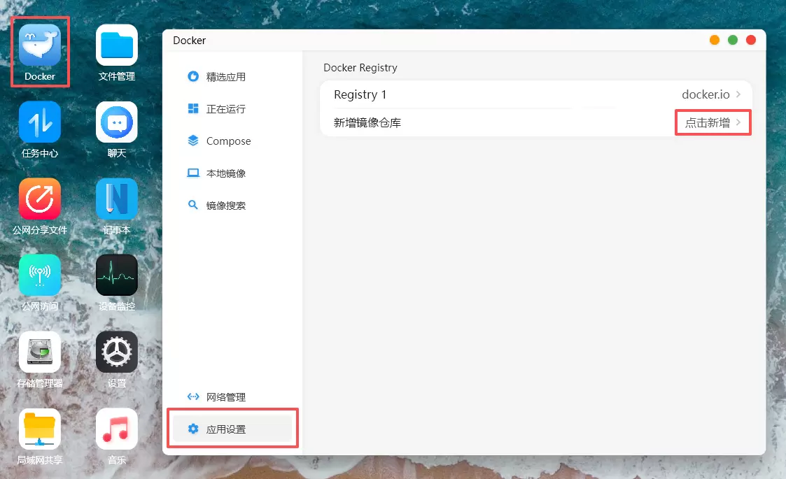 以新增配置ghcr.io 镜像仓库为例,打开赛博云空间APP-Docker,应用设置,点击新增。